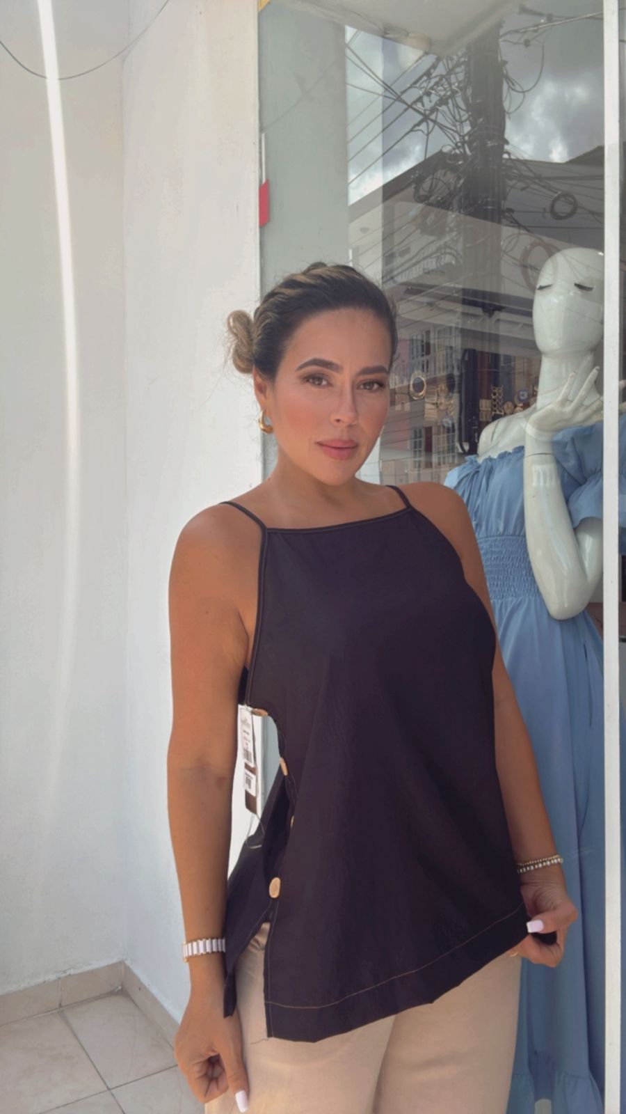 Blusa negra elegante, corte moderno, tela ligera y caída suave, ideal para ocasiones especiales por su estilo sofisticado y femenino.