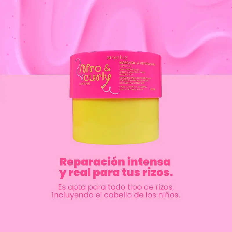 Nuestra mascarilla reparadora Afro & Curly es la solución perfecta para hidratar y reparar profundamente tus rizos. Su fórmula intensiva, enriquecida con aceite de coco, aceite de argán, aceite de aguacate, colágeno y ácido hialurónico, trabaja de manera efectiva para nutrir, fortalecer y restaurar los rizos secos, dañados y maltratados. Gracias a su poderosa combinación de ingredientes naturales, esta mascarilla repara las hebras dañadas, sella la hidratación y mejora la elasticidad del cabello, dejándolos más suaves, definidos y libres de frizz. Su textura cremosa facilita la aplicación, proporcionando una experiencia suave y reconfortante, y es apta para todo tipo de rizos, incluyendo el cabello de los niños. Ideal para quienes buscan recuperar la vitalidad de sus rizos y mantenerlos saludables, manejables y llenos de vida.