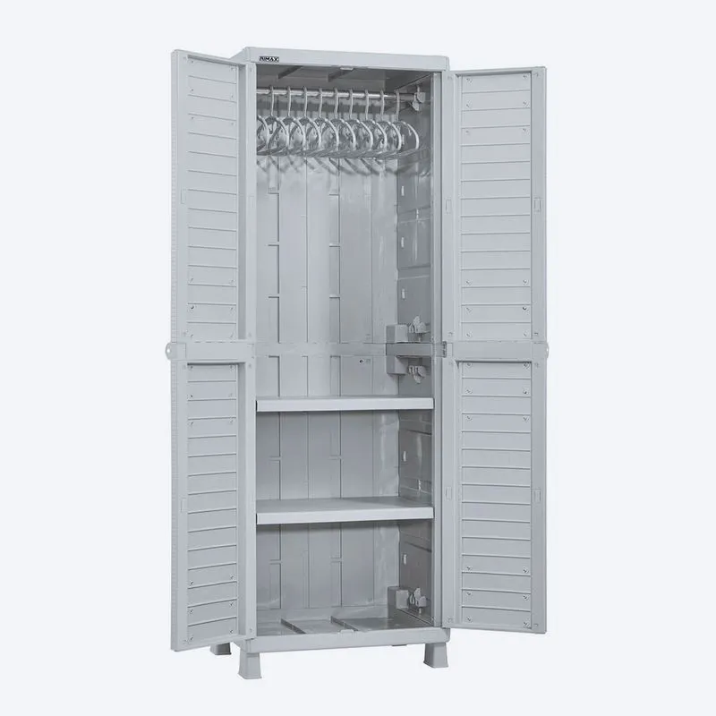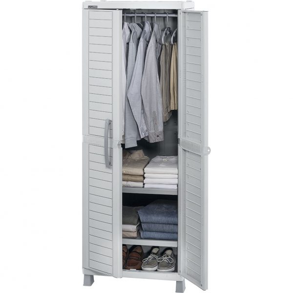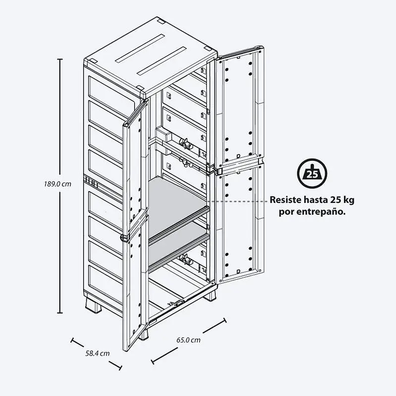 Descripción: Armario plástico con 2 entrepaños ajustables que soportan hasta 25 kg cada uno, tubo de aluminio para colgar ropa y profundidad ideal para organizar prendas sin que se arruguen. Incluye 6 ganchos Rimax y orificio para colocar candado. Su diseño moderno, funcional y resistente lo hace perfecto para interiores y exteriores.