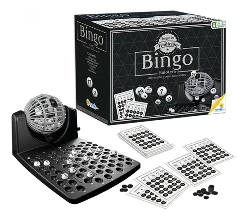 Juego de bingo con balotera giratoria para una experiencia real.