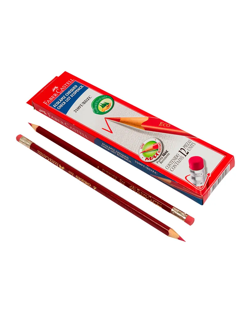 Lápiz chequeo triangular Faber-Castell. Borrador libre de PVC. Lápiz chequeo de mina roja, resistente y suave, para facilitar el proceso de escritura. Excelente calidad. Forma ergonómica triangular que facilita el pin de agarre. Barniz del mismo color de la mina. Fabricados con madera 100% reforestada.