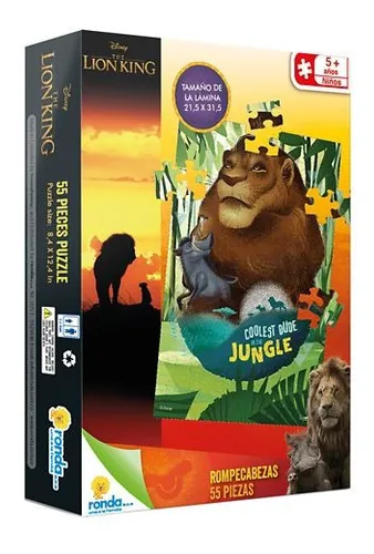 Rompecabezas infantil con personajes del Rey León, colores vivos y diseño llamativo.