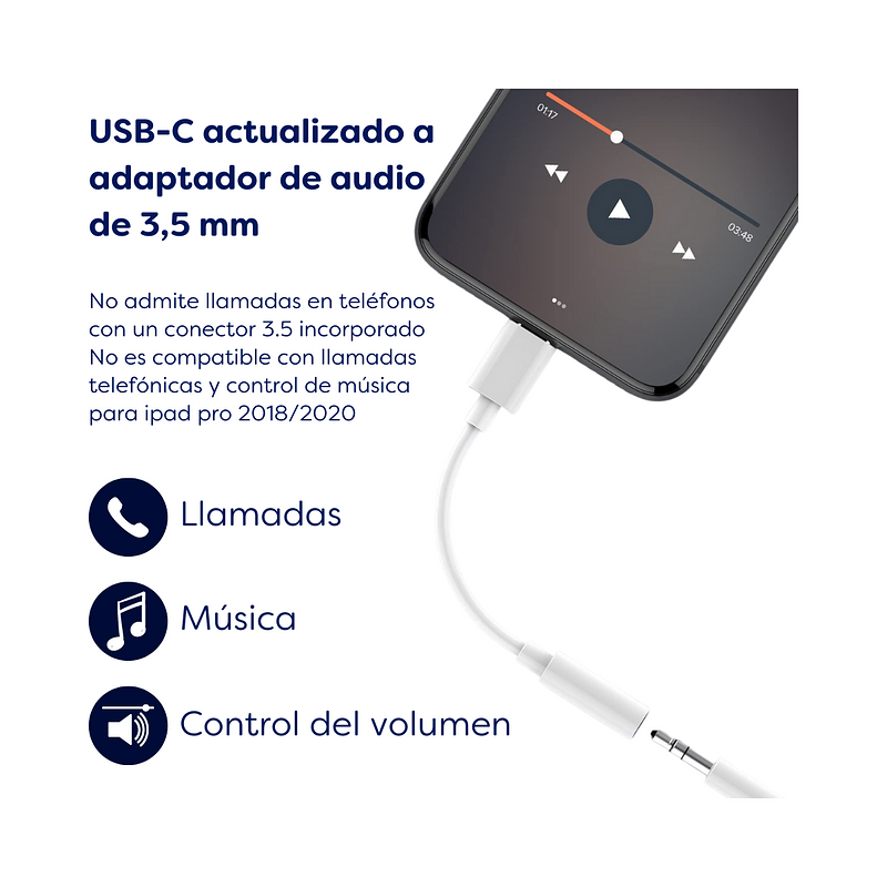 Control remoto y llamadas telefónicas; te permite reproducir/pausar música, volumen +/ - y contestar/finalizar/rechazar llamadas. Con este adaptador de audio USB C a 0.138 in, puedes disfrutar de tu música favorita con auriculares con cable de 0.138 in a tus teléfonos celulares y tabletas tipo C que tienen el adaptador de conector de auriculares de 0.138 in.