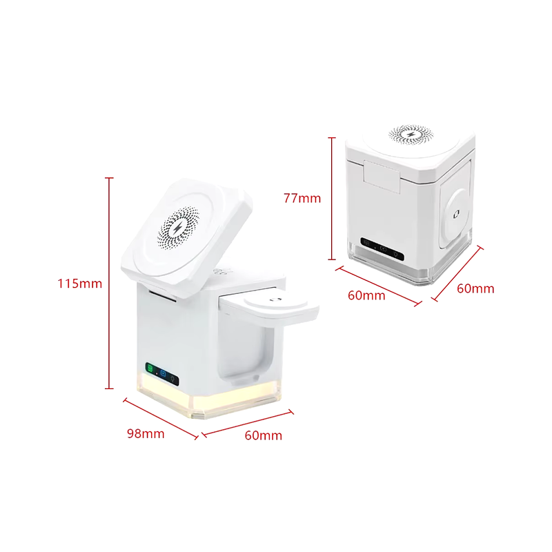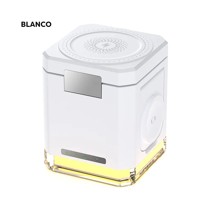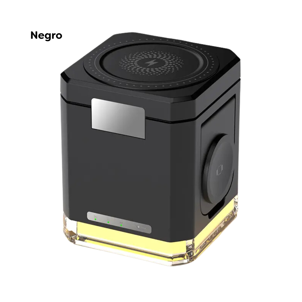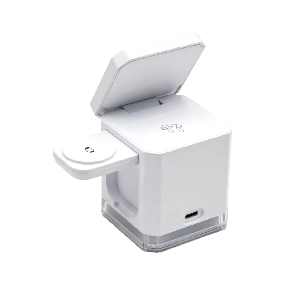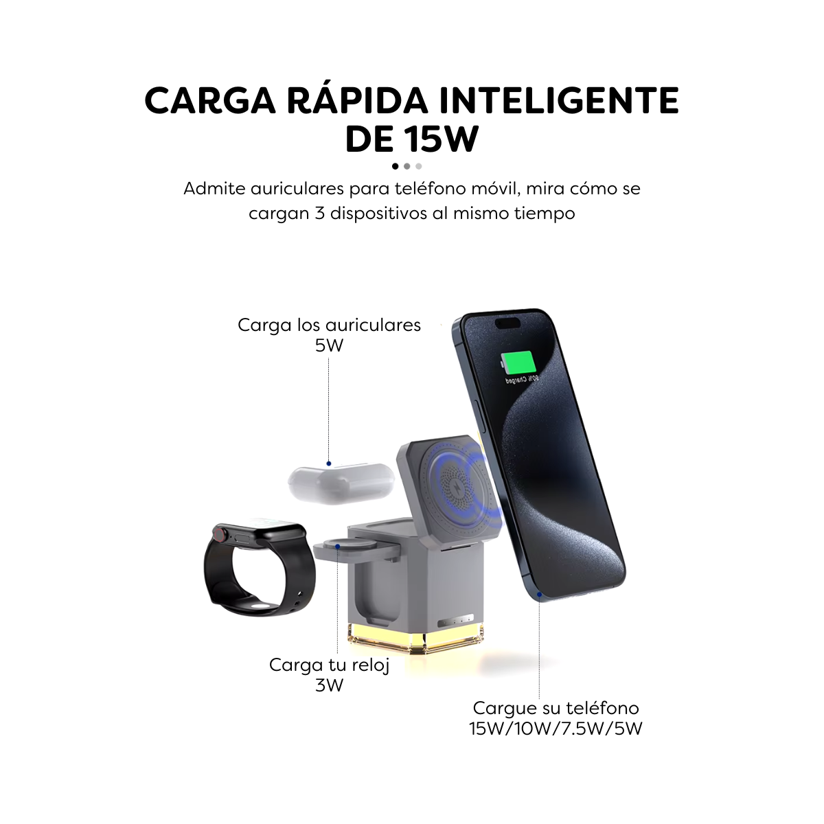 Cubo de 15W Max Carga rápida inalámbrica plegable para Iphone, reloj inteligente y audifonos, conecta 3 productos a la misma vez.