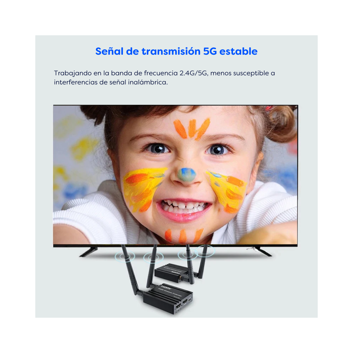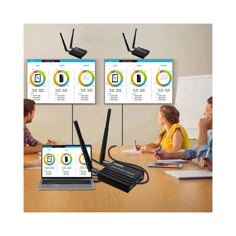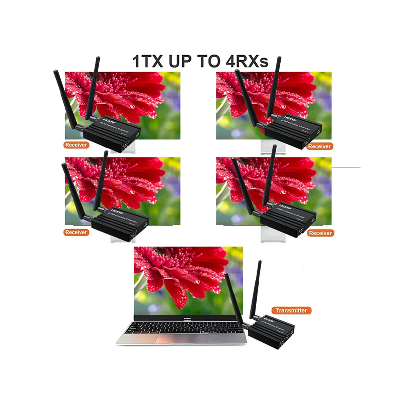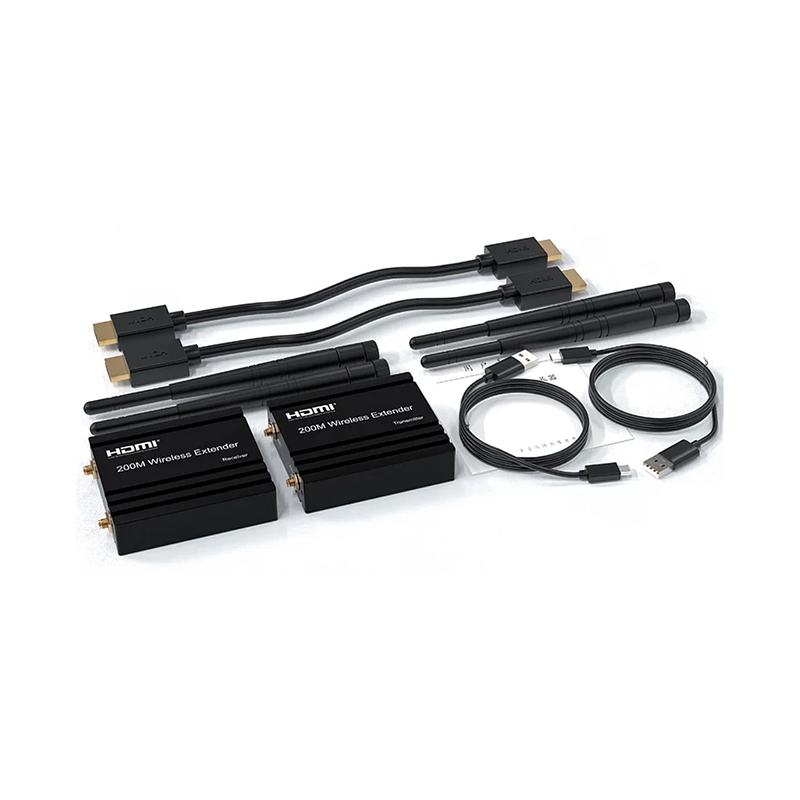 Este extensor inalámbrico HDMI utiliza módulos 2,4G y 5G para permitir una comunicación inalámbrica de alta velocidad y alto rendimiento entre productos electrónicos de consumo, ordenadores y dispositivos móviles. Combina una alta capacidad de ancho de banda y una fuerte capacidad de corrección de errores para transmitir vídeo HD. Transmite la señal hasta 200m en el área abierta, también atraviesa la pared.