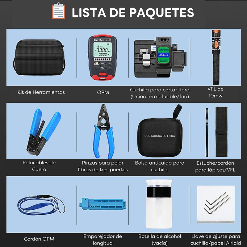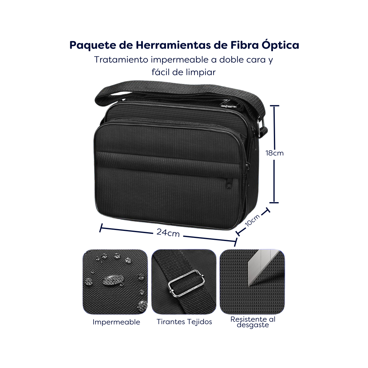 Este completo kit de herramientas para fibra óptica FTTH ha sido diseñado para técnicos y especialistas en instalación y mantenimiento de redes de fibra óptica. Es ideal para trabajos de campo, pruebas y preparación de cables en proyectos FTTx gracias a su conjunto versátil de herramientas esenciales.