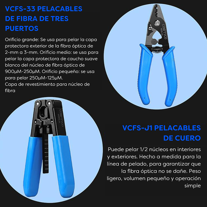 Herramientas auxiliares – incluye pelacables para diferentes diámetros de fibra y cable (p. ej., 250 µm, cables FTTH), pinzas de stripping, llave para cortadora y accesorios como papel libre de polvo y botella para alcohol para limpieza.