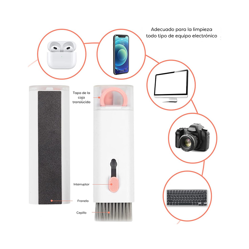 7 en 1: Herramienta de limpieza todo en 1 para laptop y auriculares, incluyendo bolígrafo de limpieza para Airpod con clip de silicona, clip de plástico, esponja flocada y cepillo, spray de solución de limpieza de pantalla, cepillo retráctil de teclado de alta densidad con paño de microfibra, llavero y paño de limpieza de gafas de felpa suave.