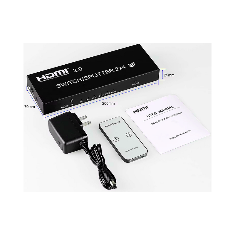 El divisor de conmutación HDMI 2.0 2x4 conecta dos fuentes HD a cuatro terminales de pantalla HD. Puede distribuir fácilmente la señal HD generada por 2 fuentes HD a 4 monitores o proyectores que admitan señales HD y también amplificar la señal HDMI. Las dos fuentes se pueden cambiar. entre sí. Este divisor de interruptor HDMI puede admitir formatos HD que incluyen 720p, 1080i, 1080p, 2160p, admite salida de audio para auriculares Salida de audio de 3,5 mm y SPDIF.
