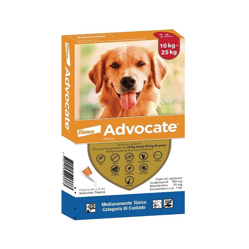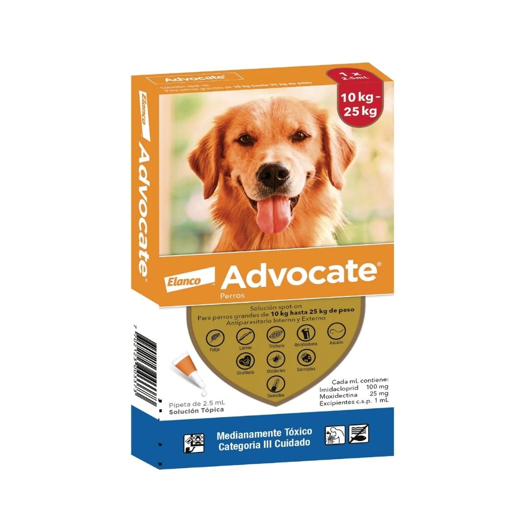 ADVOCATE® es un antiparasitario tópico de amplio espectro, diseñado para proteger a perros de 10 a 25 kg. Su fórmula avanzada elimina pulgas, ácaros, gusanos intestinales y previene la filariosis (gusano del corazón), cuidando a tu mascota desde adentro hacia afuera.