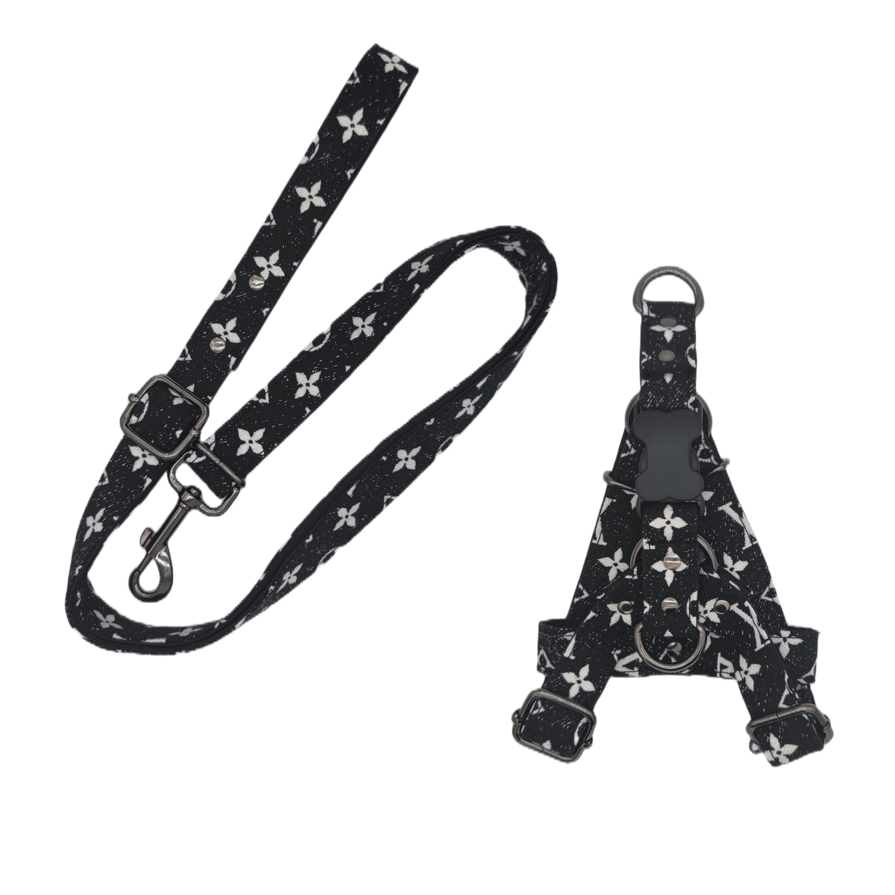Arnés con diseño LV en negro, TALLA XL. Fabricado en material resistente y fácil de lavar, incluye correa.