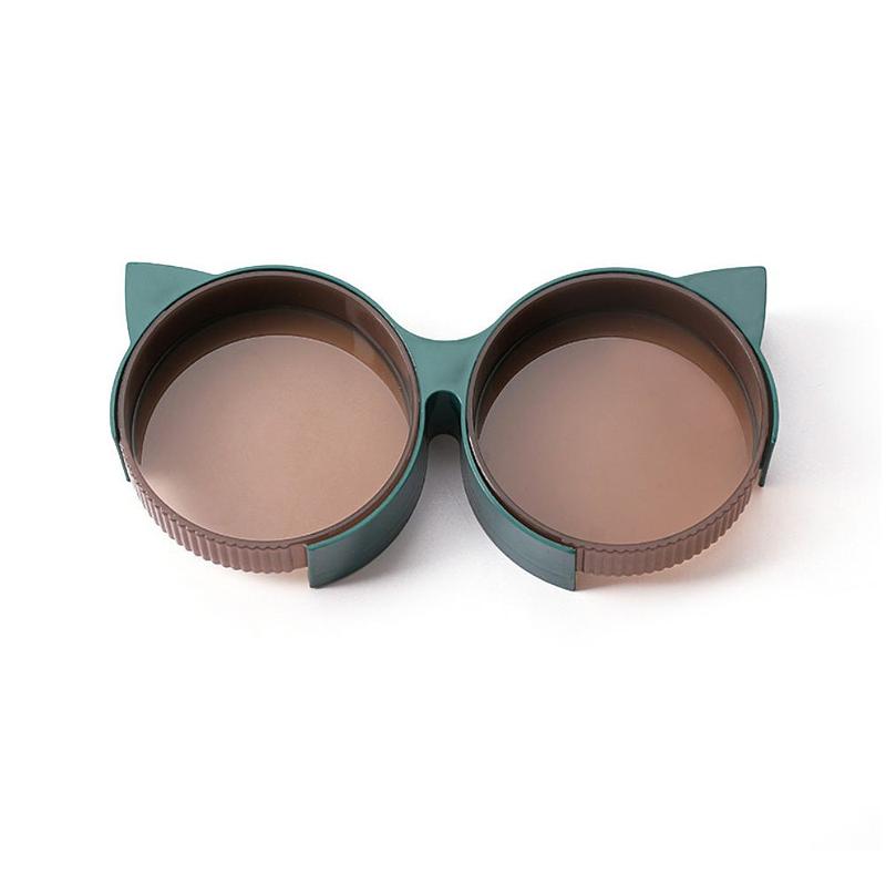 Comedero doble con diseño de gatito, fabricado en plástico liviano.