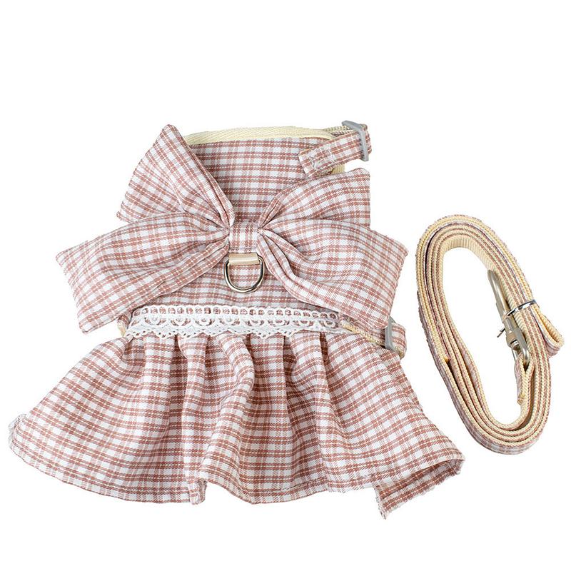 Vestido con correa de diseño de cuadros y moño, ideal para gatos o perros pequeños.