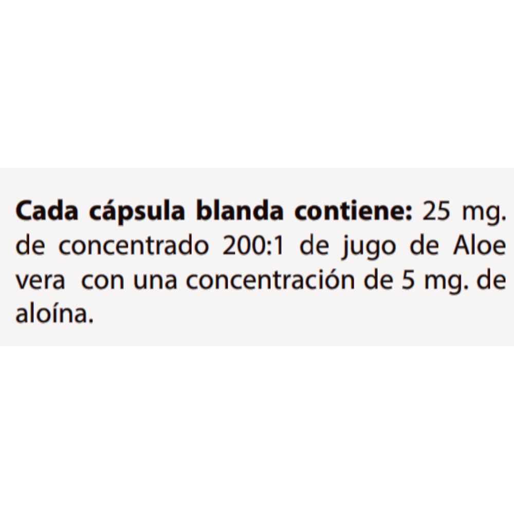25 mg. de concentrado 200:1 de jugo de Aloe vera con una concentración de 5 mg. de aloína.