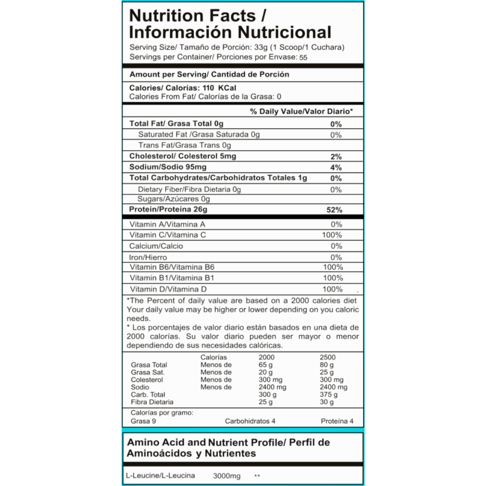 Ingredientes: Proteína Aislada de Suero, Caseína Micelar, L-Leucina, Goma Guar, Vitamina C (Ácido Ascórbico), Vainilla Gourmet (Saborizante Idéntico al Natural), Stevia (Edulcorante), Dióxido de Silicio, Vitamina B6 (Piridoxina), Vitamina B1 (Tiamina), Vitamina D3.