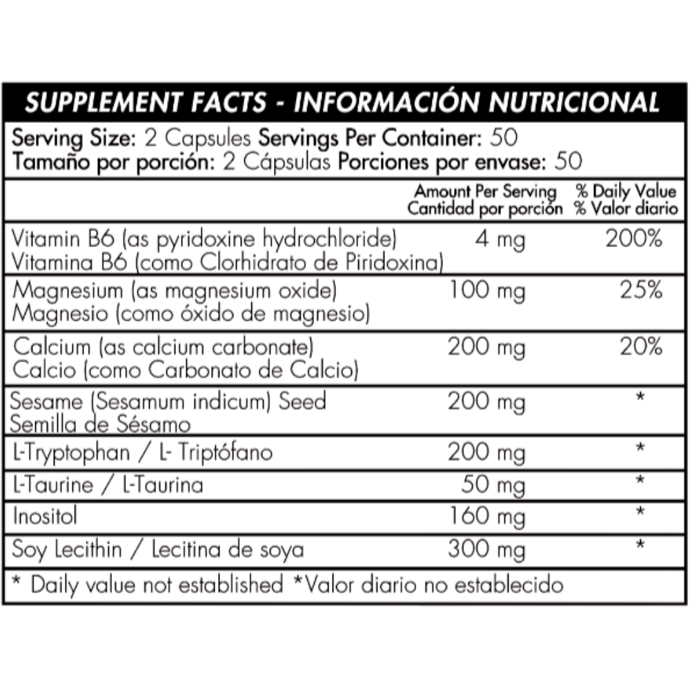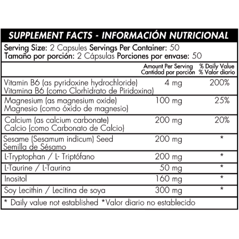 Inositol (vitamina), L-Taurina (aminoácido), L-Triptófano (aminoácido), Semilla de sésamo (sesamum indicum) (vegetal), Vitamina B6 (piridoxina clorhidrato) (vitamina), Carbonato de calcio (mineral), Óxido de magnesio (mineral), Lecitina de soya (vegetal).