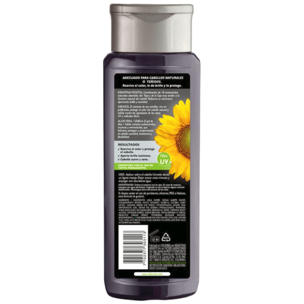 Nueva fórmula de triple acción, con extracto 100% natural de Semilla de Girasol, Aloe Vera, Henna y Keratina Vegetal para cabellos naturales o teñidos. Reaviva el color y a la vez lo protege. Si quieres un cabello suave, brillante, sano y con color, no dudes en usar la Línea Coloursafe reflejos color Negro. La revolución del color.