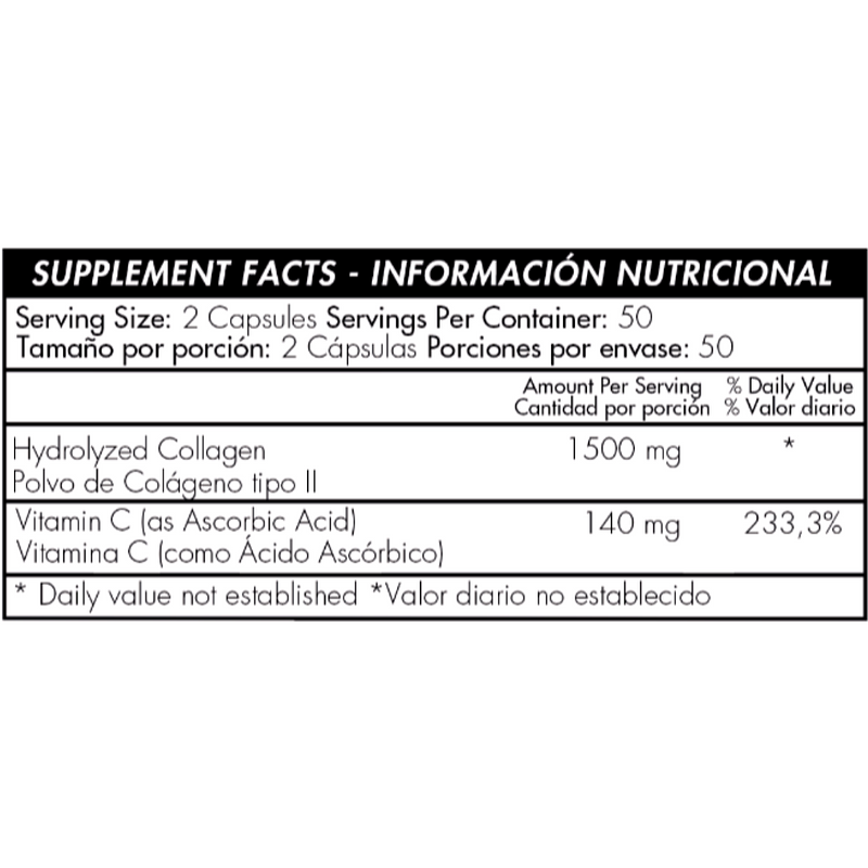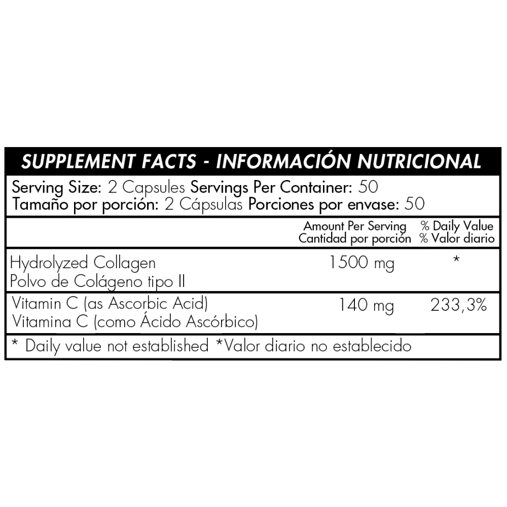 Polvo de Colágeno tipo II (de pollo) (origen aviar), Vitamina C (ácido ascórbico) (vegetal).