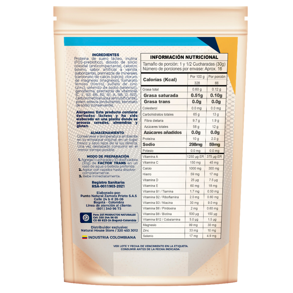 COMPOSICIÓN: Mezcla para preparar bebida con vitaminas y minerales con: calostro bovino, betaglucanos de Ganoderma, vitamina C, Polen, Zinc, potasio, Niacina, hierro, magnesio, vitamina D3, Vitamina A, Tiamina, riboflavina, piridoxina, vitamina B12.