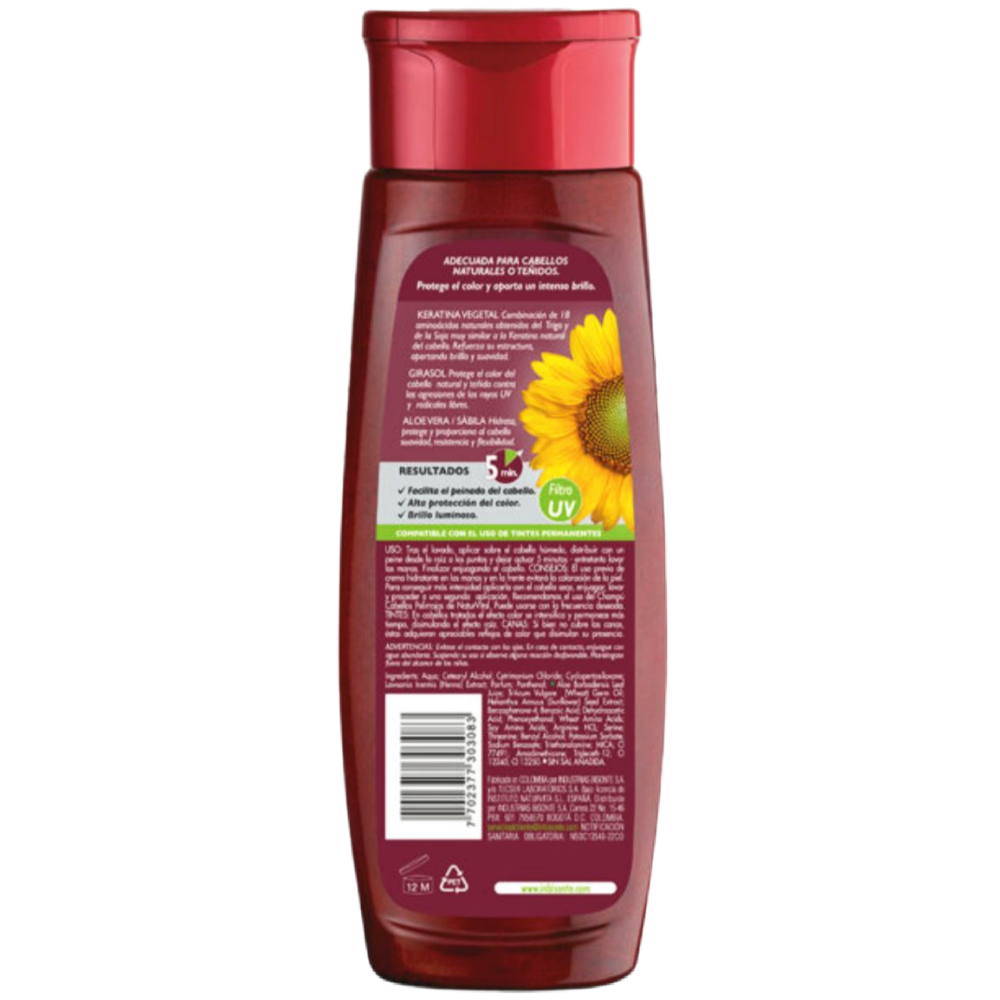 Nueva fórmula triple acción, con extractos 100% natural de Germen de Trigo, Henna y Semillas de Girasol para cabellos naturales o tinturados, aporta color sin amoniacos realzando el color natural del cabello y a la vez que lo protege de las agresiones del sol, dejándolo más suave, sano y brillante. El color que tú quieres, de manera natural y en solo 5 minutos. Es compatible con el uso de tintes permanentes y el efecto color se elimina progresivamente en 3 ó 4 lavados.