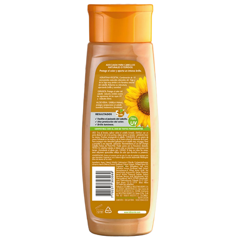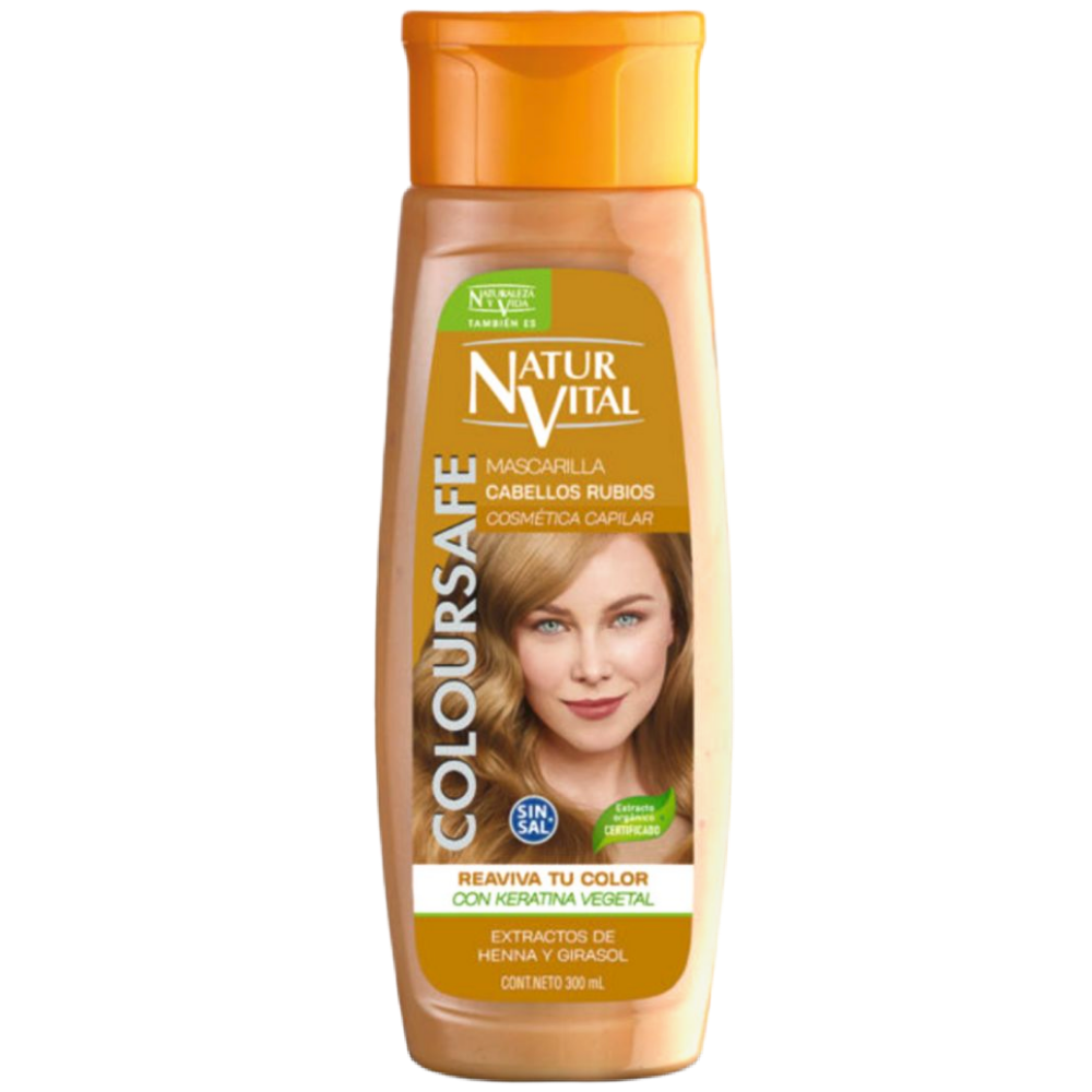 Mascarilla con nueva fórmula triple acción, con extractos 100% natural de Germen de Trigo, Henna y Semillas de Girasol para cabellos rubios naturales o tinturados, aporta color sin amoniacos realzando el color natural del cabello y a la vez que lo protege de las agresiones del sol, dejándolo más suave, sano y brillante. El color que tú quieres, de manera natural y en solo 5 minutos. Es compatible con el uso de tintes rubios permanentes y el efecto color se elimina progresivamente en 3 ó 4 lavados.