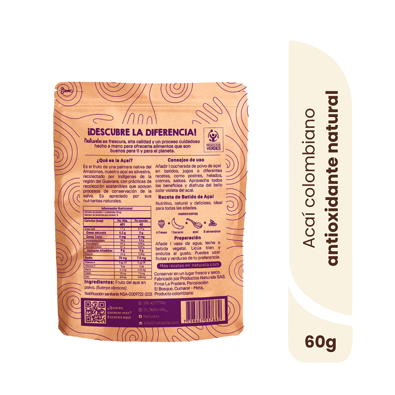 El açaí o también conocido como acaí, en polvo es un superalimento que se ha vuelto muy popular en los últimos años gracias a sus múltiples beneficios para la salud. Este polvo se elabora a partir del fruto del açaí o fruta brasilera; es el fruto de una palmera nativa del amazonas, nuestro açaí es silvestre recolectado por indígenas de la región del Guaviare, con prácticas de recolección sostenible que apoyan procesos de conservación de la selva.