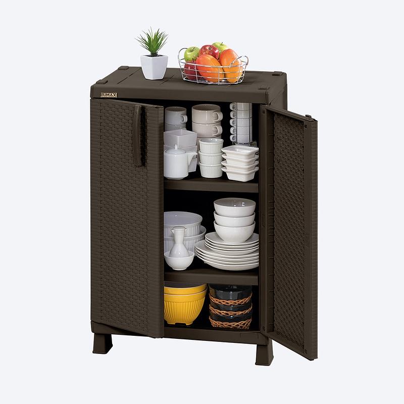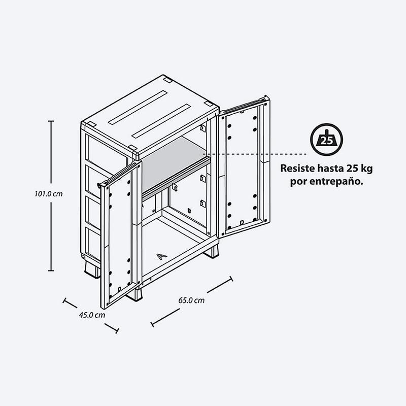 Armario Mediano con textura Rattan, con 2 entrepaños ajustables que resisten hasta 25 Kg cada uno.