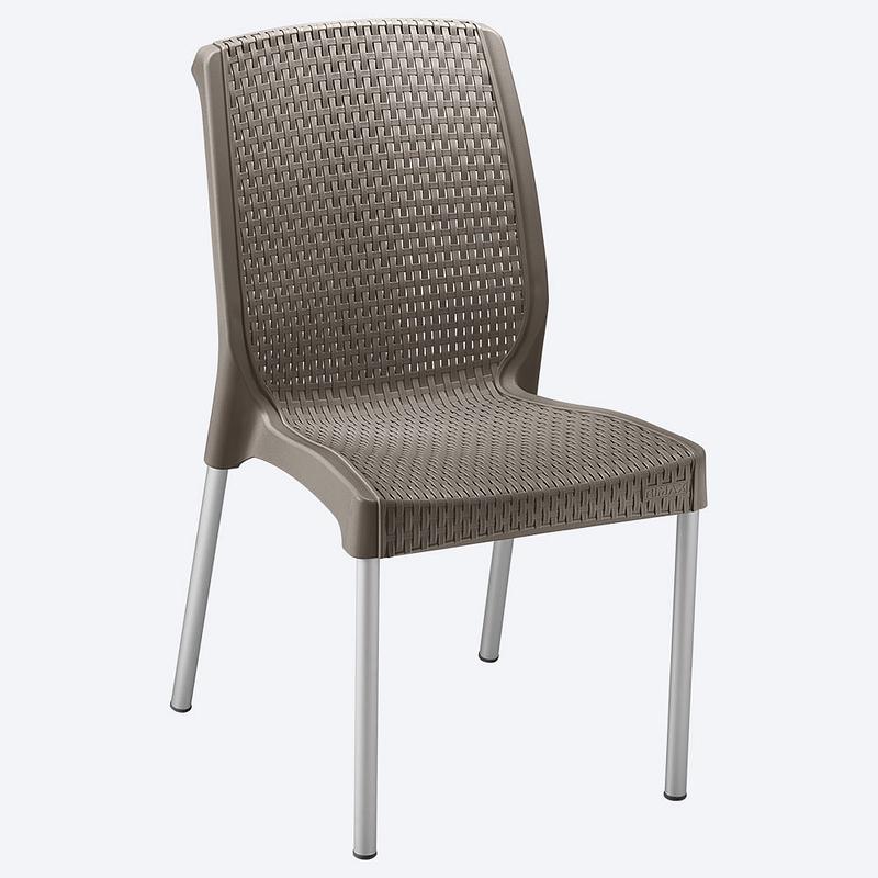 Silla SHIA con apariencia Rattan, con tejido perforado que imita el tejido artesanal. Exclusiva mezcla de materiales y patas en aluminio que no se oxidan. Con tacón antideslizante. Cómoda y ergonómica.