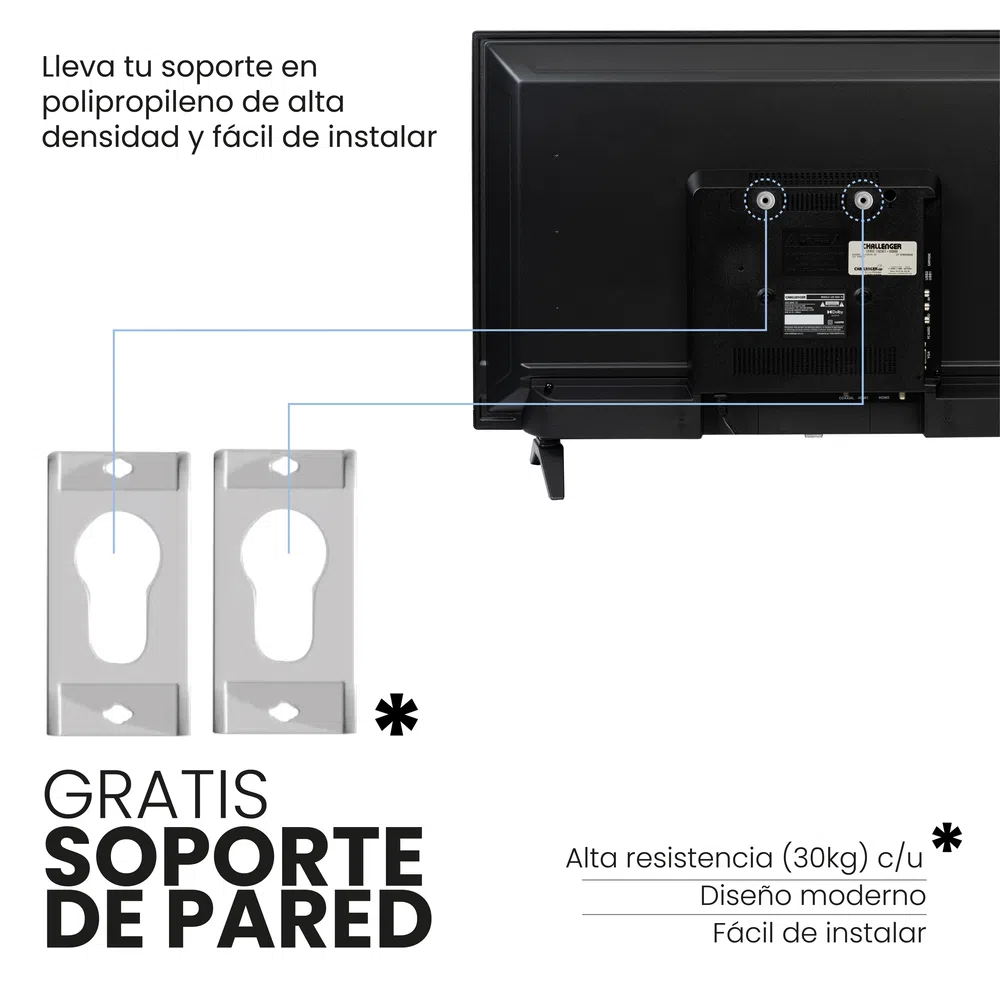 Televisor de 32" (80 cm) HD, TDT, Entrada para PC, DVB T2, incluye soporte de pared.