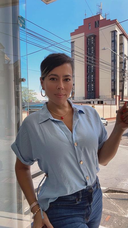 Blusa en tono azul suave con botones frontales y manga corta, elaborada en chalis, súper fresca y cómoda.