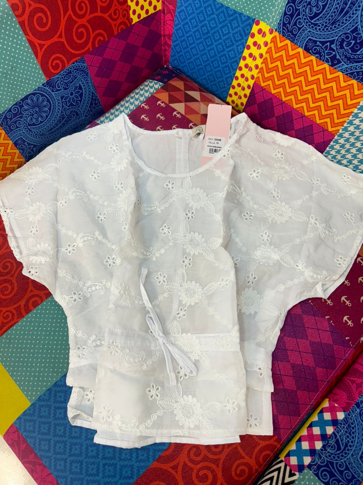 Blusa blanca bordada con flores, manga ancha y amarre frontal. Fresca, femenina y perfecta para outfits elegantes o casuales.