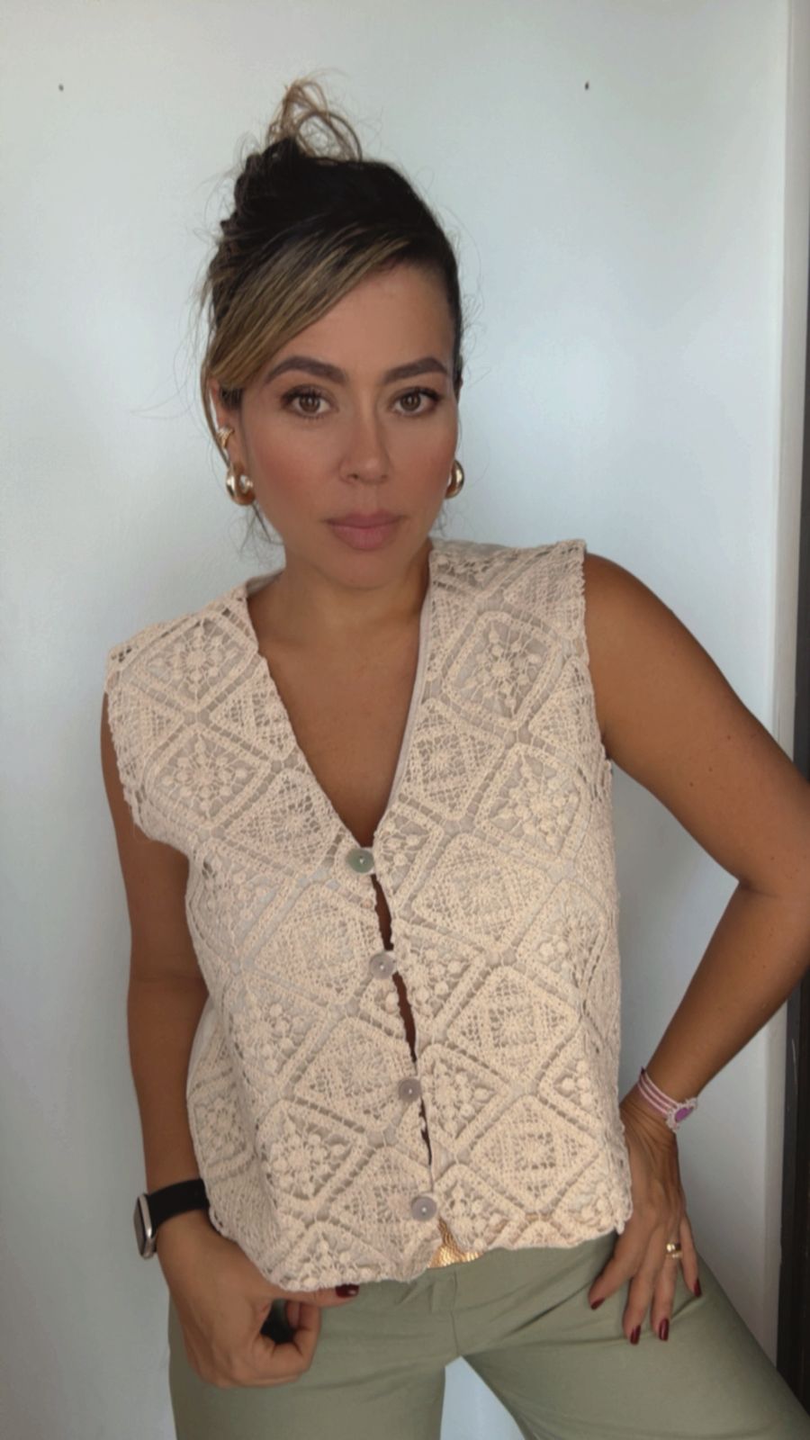 Chaleco color camel con textura en encaje, elegante y versátil. Perfecto para looks femeninos, frescos y sofisticados.