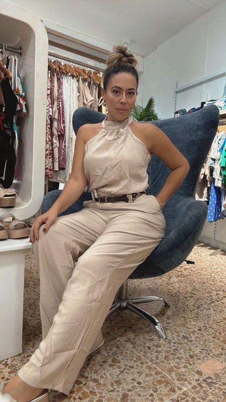 Enterizo confeccionado en tela fresca con cuello tortuga, cinturón decorativo y espalda descubierta. Una prenda moderna, cómoda y elegante, ideal para días cálidos y ocasiones especiales.
