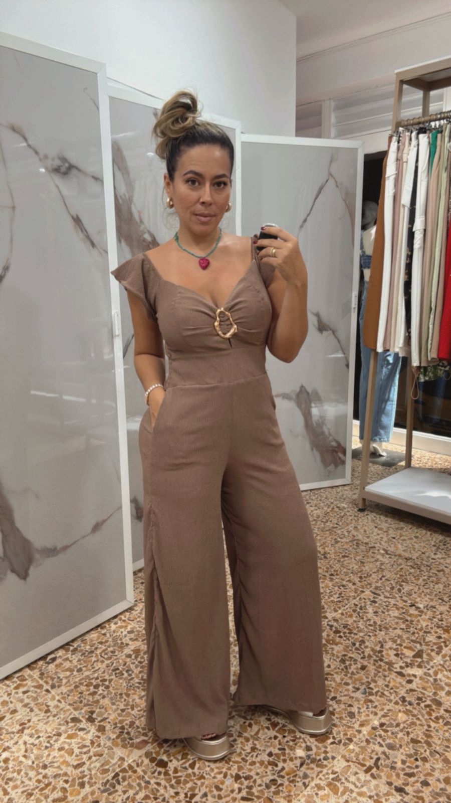 Enterizo elegante en color camel confeccionado en tela crepé de caída perfecta. Su diseño moderno y estilizado lo hace ideal para eventos