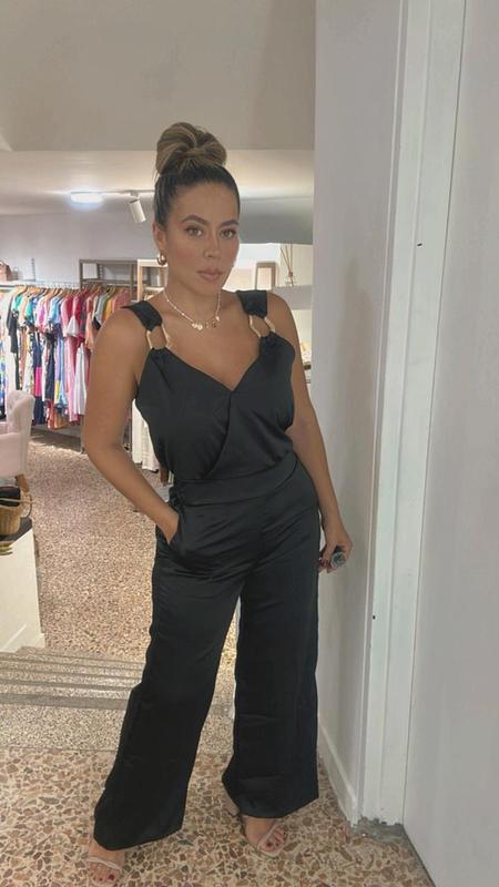 Enterizo negro en satín con herrajes dorados, caída fluida y estilo sofisticado. Perfecto para eventos, cenas y noches especiales donde quieras destac