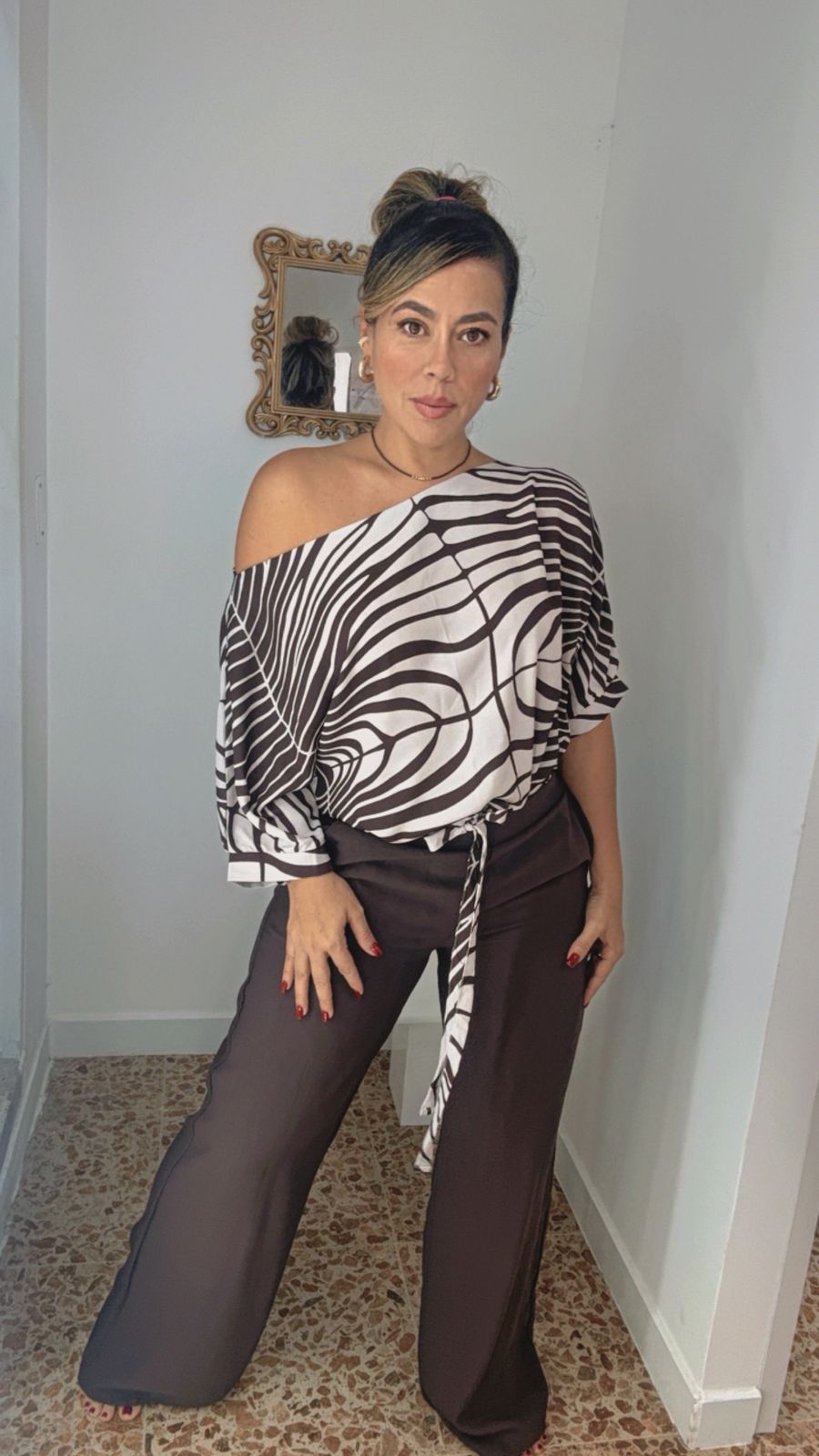 Set en beige y café, elegante y moderno. Con diseño fluido y cómodo que estiliza la figura. Ideal para lucir sofisticada y versátil en cualquier