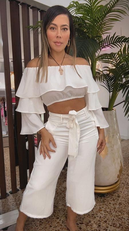Set blanco elegante con crop top off shoulder y mangas con vuelos, combinado con pantalón palazzo de tiro alto. Fresco, cómodo y perfecto.