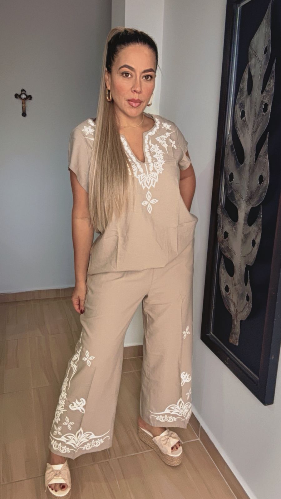 Set Elegancia Natural Con Detalles Estampados En Beige