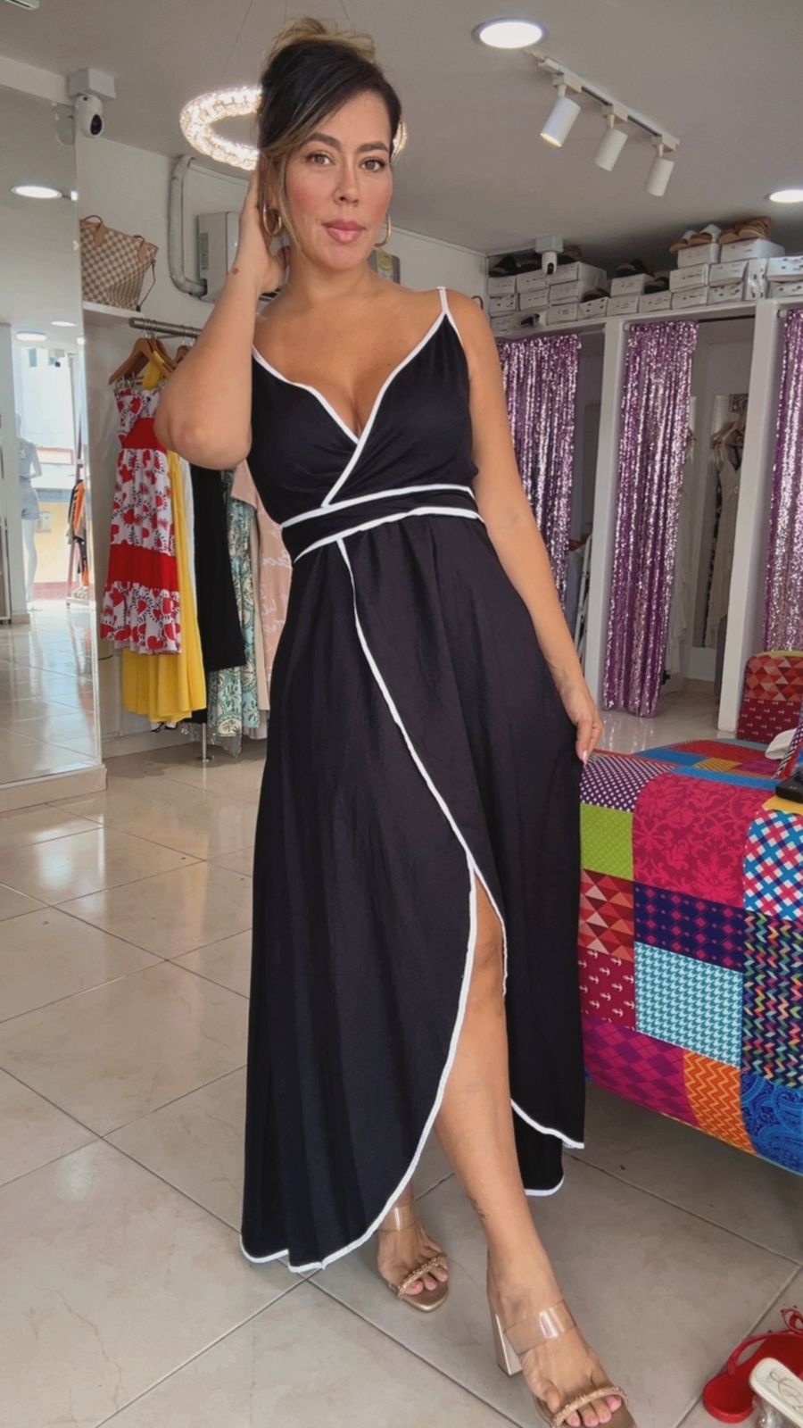 Elegante vestido largo negro con tirantes y ribetes blancos. Diseño cruzado que estiliza la figura y abertura frontal que aporta un toque moderno.