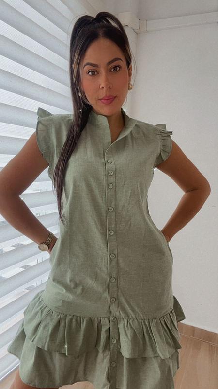 Vestido verde claro, con botones y bolero doble en la parte inferior de la falda, manga con bolero.
