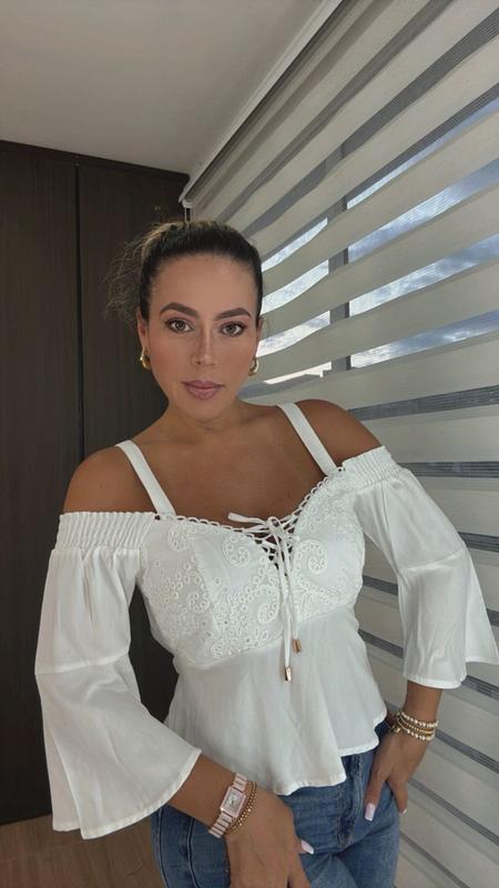 Blusa blanca, tipo bandeja mangas acampanadas con encaje y lazo frontal, caída ligera y femenina, ideal para looks frescos y romántico.